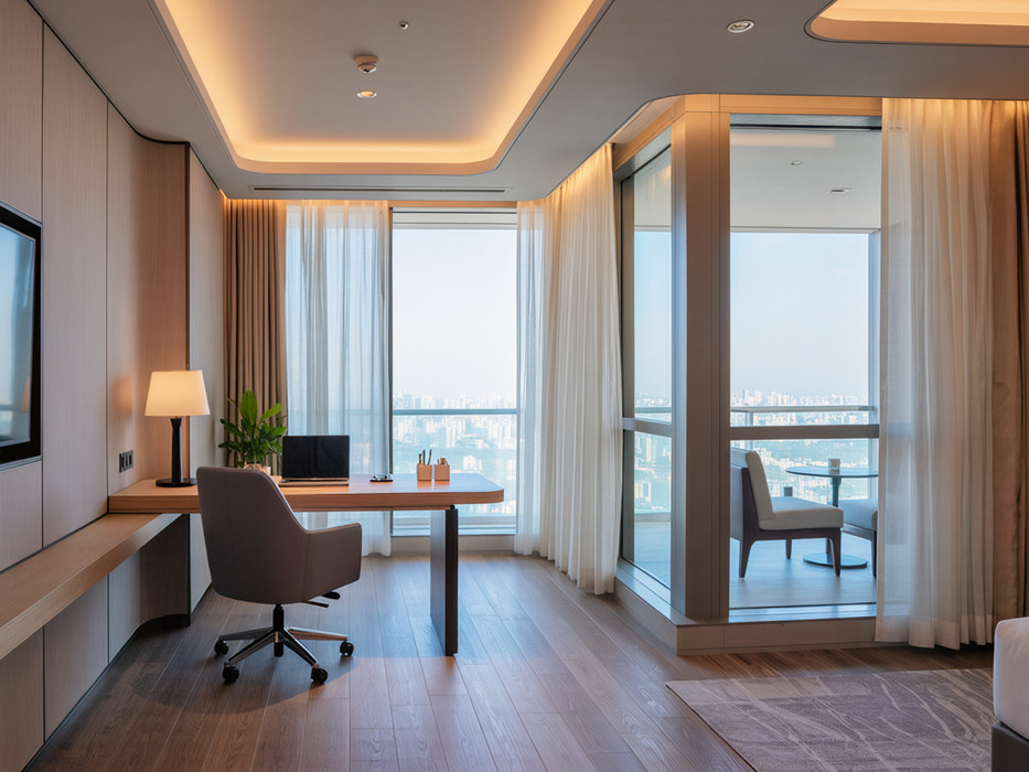 Comfort is prioritized with daily housekeeping, air conditioning, linens, slippers, mosquito nets, humidifiers, and personalized wake-up service. Guests also benefit from added touches like umbrellas, air purifiers, fans, and alarm clocks. Rooms feature beautiful layouts with wooden flooring, carpeting, desks, luggage storage, and city or balcony views from higher floors.